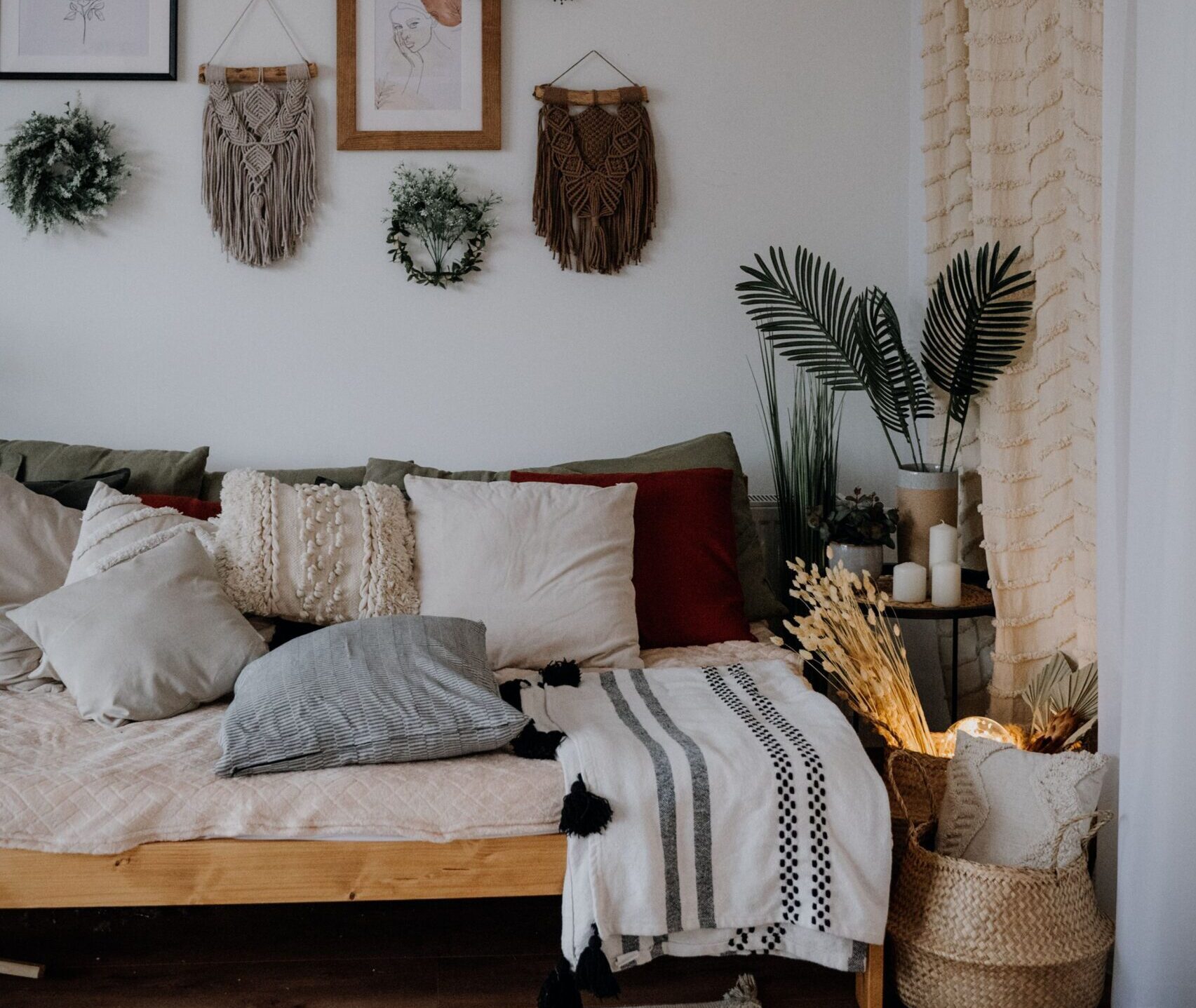 Sceneria z drewnianym łóżkiem, dużą ilością roślin, na tle ściany z wieloma dodatkami. Idealna do sesji lifestyle.